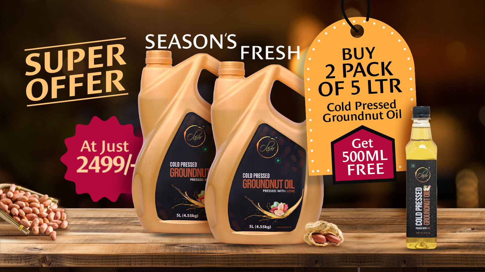 Cold Pressed Groundnut Oil (5 ltr) - Pack of 2 + Groundnut Oil 500 ML Free Combo